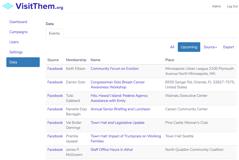 Town Hall DataWe scour the web for data about when congressional town halls are happening — searching a variety of sources 24 hours a day, 7 days a week. We’ve written automated tools to scrape official .gov sites and congressional Facebook feeds, in addition to using data crowd-sourced by volunteer activist organizations like Town Hall Project and our own users. Our goal is to have the most comprehensive and up-to-date data set of these events.