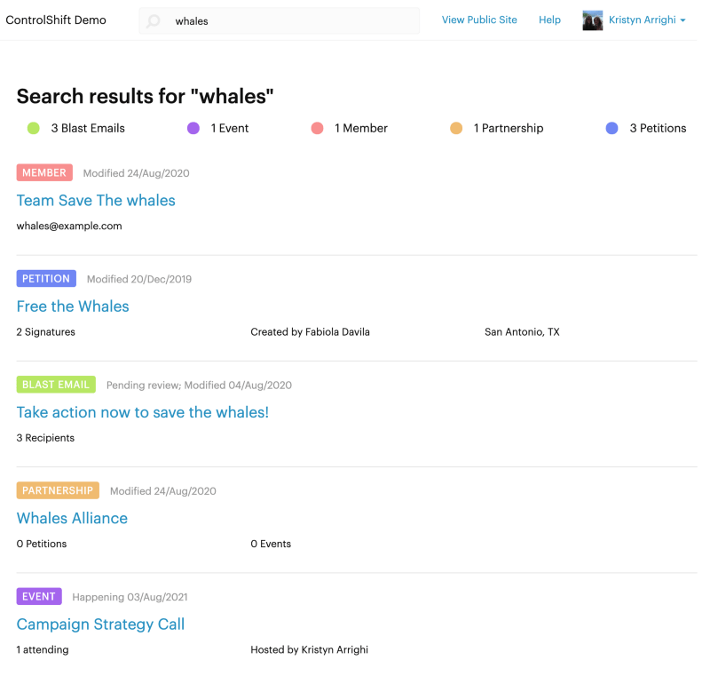 We’ve released a new search interface that makes it easier for admins to find what they’re looking for within their ControlShift platform. With the new search bar at the top of the admin tools pages, admins can enter a search term and see results from across the platform, including members, events, petitions, partnerships, and emails.