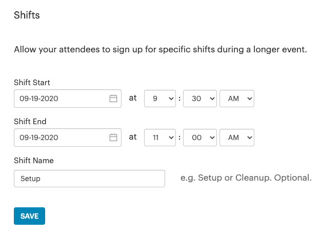 After creating an event, it’s easy to create time slots for shifts within the event.
