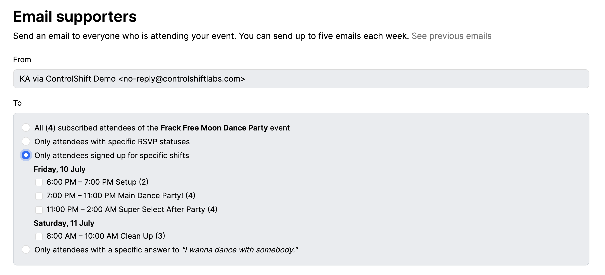 Beyond the custom field targeting that’s available for both petitions and events, additional targeting options are also available for event hosts. For events with shifts, hosts can now target their messages to the attendees of one or more shift. This allows the host to speak only to the setup and clean up teams, for example.