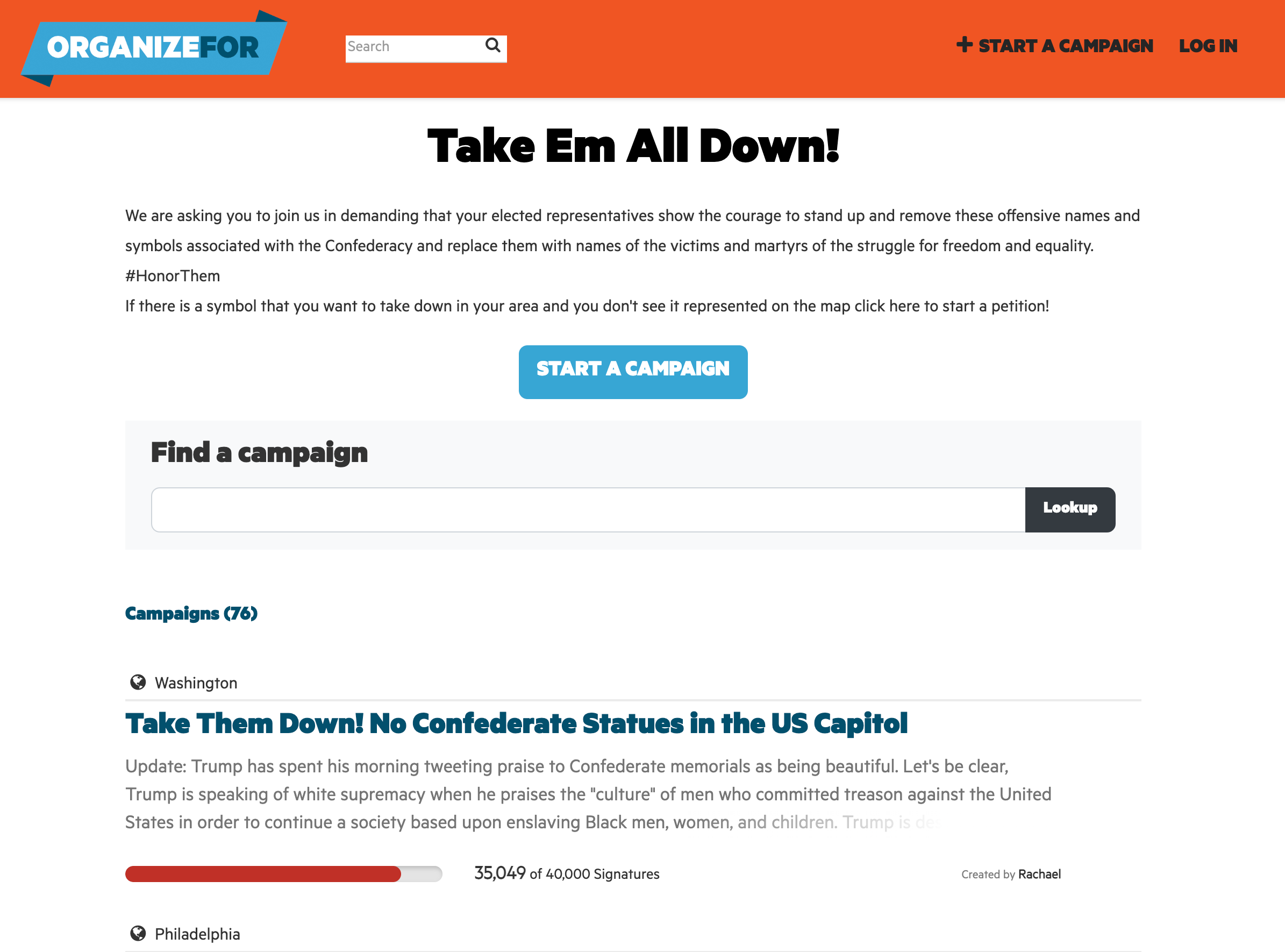 They created an open-ended Effort where members could identify a target in their town — like Robert E. Lee High School — and create a templated petition asking that the name be changed. When members arrived at the Effort hub page, they could search on their area and find an existing campaign to support or start one of their own.