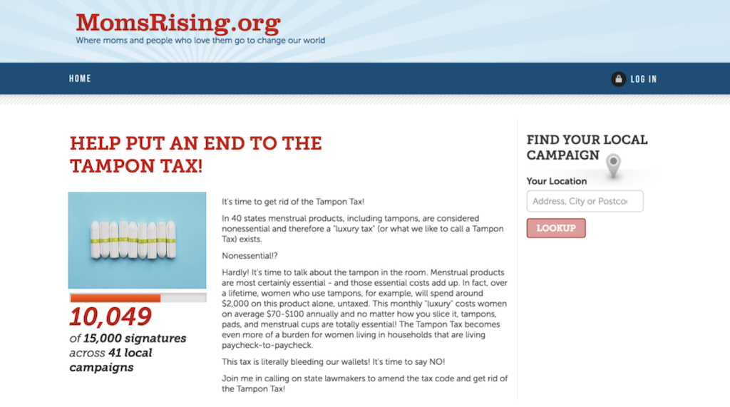 MomsRising noticed an issue taking off: across Europe and Australia, flashy protests were flaring up about unfair taxes on women’s products. These products — like tampons — were considered “unessential” and therefore subject to taxes, while other health and medical products were tax exempt. These protests were getting a lot of attention on social media and spreading to other countries.